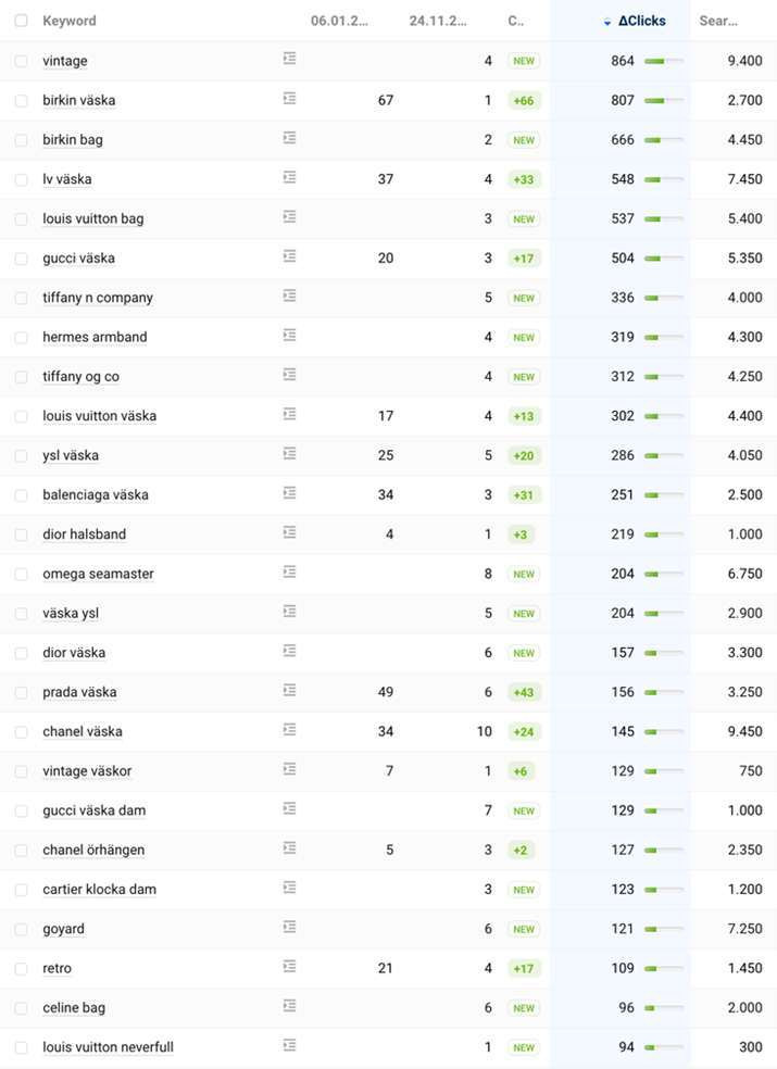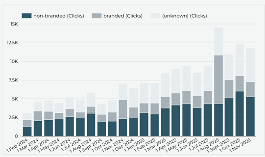Den månatliga utvecklingen visar att non-branded trafik nu står för större delen av tillväxten. Tidigare var varumärkessökningar en alltför stor andel. Nu driver generiska sökningar inom vintage, specifika modeller och varumärken den tydligaste ökningen vilket har lett till ett brett inflöde av nya kunder som inte tidigare kände till A Retro Tale, en större marknadsandel inom produktkategorier samt en utökning av varumärkeskännedomen i det organiska söket.