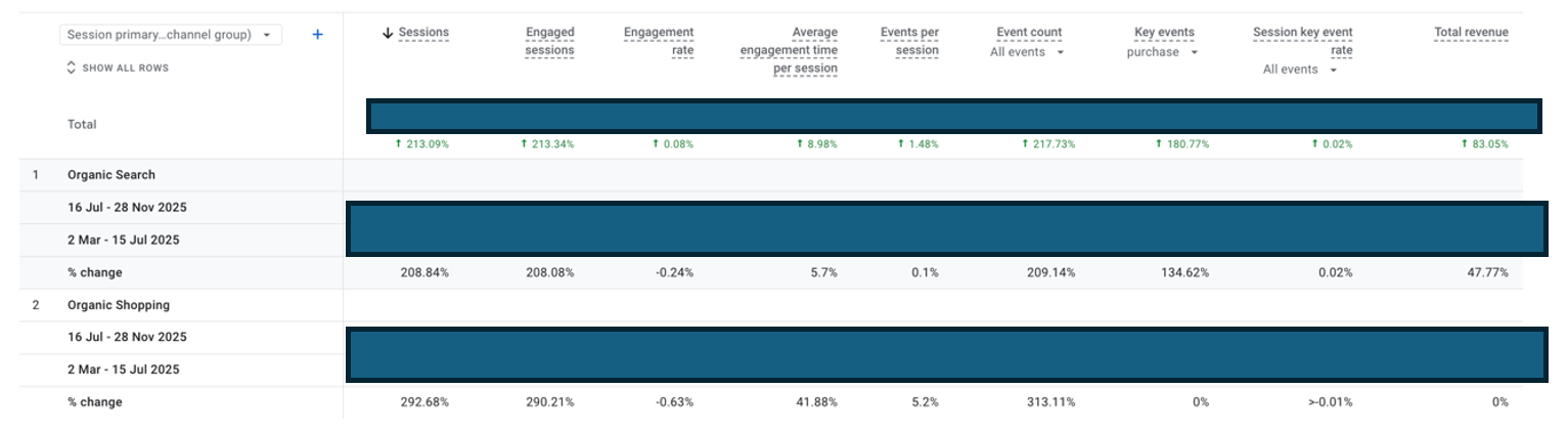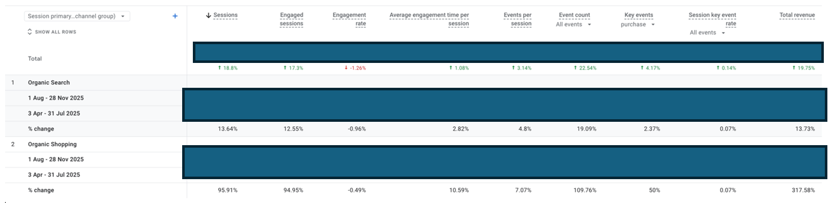 Norge har ökat sin synlighet i rasande fart. Efter lokaliseringen och optimering utifrån norsk sökordsanalys i september tog den norska sajten fart och började driva in trafik. Sajten har gått från att ha varit knappt synlig alls till att få en starkt växande närvaro på den norska marknaden. Helt nya sökord har börjat ranka och trafik har börjat komma in från nya kundgrupper som annars inte hade hittat A Retro Tale i sin sökning. Större delen av ökningen skedde under den första tiden efter lokaliseringen och initiala optimeringen vilket är ett kvitto på att strategin var helt rätt för marknaden. Både sessioner och intäkter har ökat markant både från organiskt sök och organis shopping (där A Retro Tale inte fanns innan). Detta visar tydligt hur rätt strategi, konsekvens och teknisk exekvering skapar mätbara SEO-resultat.