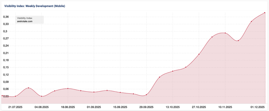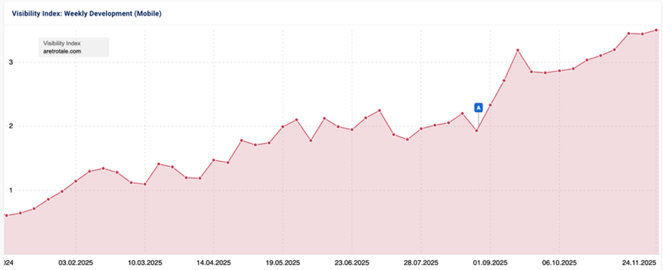 Med en stärkt närvaro inom non-branded sökningar, fler kategorier och produktsidor med affärskritiska termer som nu rankar, Större bredd i sökordsprofilen samt en ökad auktoritet på konkurrensutsatta sökord så har den svenska sajten har haft en stabil och tydligt uppåtgående trend under hela året. Grafen visar hur synligheten accelererar kraftigt i samband med våra struktur- och innehållsförbättringar.